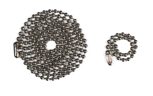 - Dwóch łańcuszków kulkowych - długi łańcuszek: 60 centymetrów i krótki: 10 centymetrów (łańcuszki z tej samej stali, co blaszki - chirurgiczna stal nierdzewna - bardzo wytrzymałe i niepodatne na korozję)
