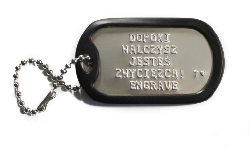 Witamy na aukcji sklepu Engrave. Oferujemy kompletne nieśmiertelniki z wybiciem. To, co wyróżnia nas od konkurencji to fakt, iż możemy wybić naprawdę dowolny tekst - również z polskimi znakami diakrytycznymi (polskimi ogonkami). Koniec z brakiem ogonków - niech Twoje dane, ulubione motto, cytat lub inny tekst wybity na nieśmiertelniku brzmi naprawdę po polsku ("A niechaj narodowie wżdy postronni znają, iż Polacy nie gęsi, iż swój język mają" - Mikołaj Rej)!