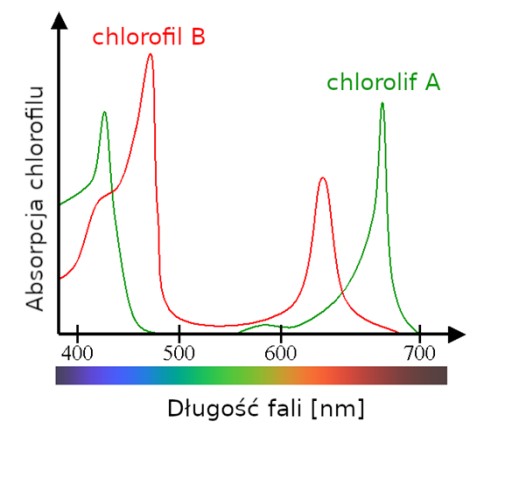 Obok przedstawiony jest wykres pochłaniania chlorofilu przez rośliny w zależności od długości fal emitowanego światła (widmo absorpcji).