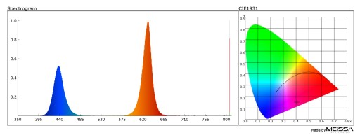 Zostało zmierzone przez firmę MEISSA. Widać na nim, że rzeczywiste widmo taśmy LED 5050 300D GROW, zmierzone profesjonalnym sprzętem. Ukazuję, że długości światła barwy niebieskiej wynoszą od 390 do 460nm ze szczytem przypadającym w 440nm, zaś dla barwy czerwonej od 580 do 660nm z najwyższą wartością w 630 nm. Odpowiada to idealnie wartościom, przy których rośliny pochłaniają maksymalne ilości chlorofilu.