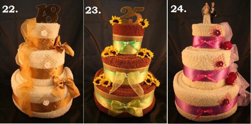 Do zaoferowania mamy duże torty z trzema haftami, składające się z 6 ręczników kąpielowych (50x100 cm). Tort możemy wykonać również z 4 ręczników (2x70x140 + 2x50x100cm), który wygląda tak samo.
