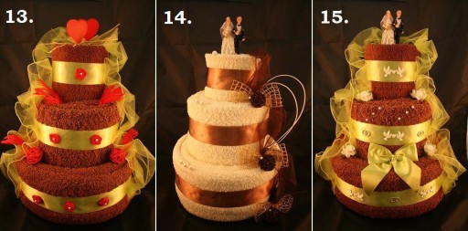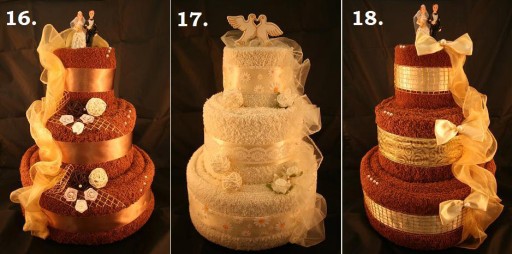 Torty dostępne są w szerokiej kolorystyce dekoracji:złota, miedziana, ecru, zielona, bordowa, czerwona, różowa, fioletowa. Poniżej przedstawiamy Nasze przykładowe realizacje, jeśli wybiorą Państwo któryś z poniższych modeli robimy je w kolorystyce jak na zdjęciu, jeśli pragną Państwo zmienić kolor ręczników lub dodatków prosimy nam o tym napisać, zrobimy tort specjalnie na Państwa życzenie. Każdy tort robimy bowiem indywidualnie pod zamówienie klienta.
