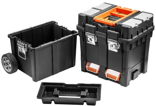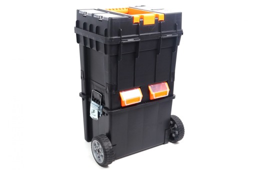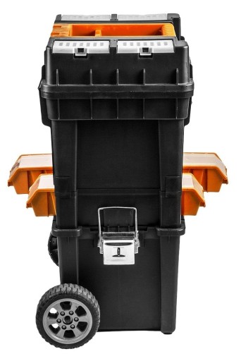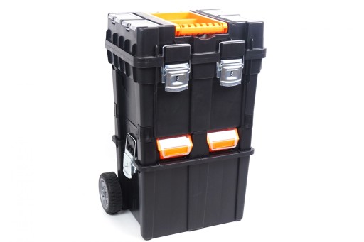 Pojemny i mobilny warsztat narzędziowy wykonana został z wytrzymałego tworzywa sztucznego z metalowymi zapięciami.