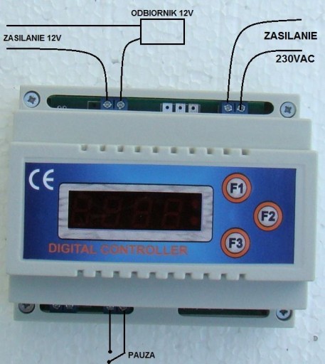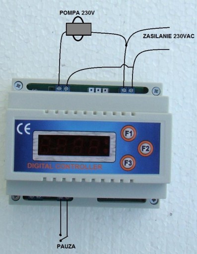 Zasilanie 230VAC, odbiornik na to samo napięcie. Zasilanie podłączamy jak widać po prawej na górze natomiast druga kostka (ta od lewej) na górze to wyjście sterownika (styki przekaźnika zwierne). Pompa jest jednym przewodem (zero) podłączona na stałe do zasilania 230V natomiast drugi przewód pompy (faza) jest załączany przez sterownik – jego styki przekaźnika. Dodatkowo można podłączyć przycisk zwierny PAUZA – nie wolno podawać żadnych napięć na to wejście! Uwaga, błędne podłączenie zasilania czy odbiornika może spowodować uszkodzenie sterownika! Należy dokonać wszystkich połączeń przy odłączonym zasilaniu 230V, dalej sprawdzić połączenia i na końcu dopiero włączyć zasilania. Zawsze sterownik podłączamy do zasilania za bezpiecznikiem minimum 6A.