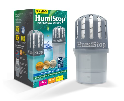 Najwyższej jakości pochłaniacz wilgoci "HUMISTOP" kontroluje i samodzielnie reguluje nadmiar wilgoci w pomieszczeniach.