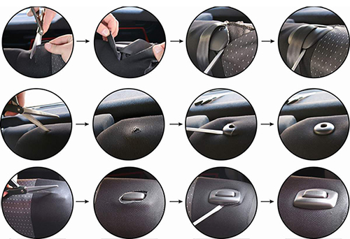W pokrowcach otwory w tylnych siedzeniach pod zagłówki i pasy robi się samemu nacinając materiał i chowając go pod element plastikowy. Materiał nie pruje się.