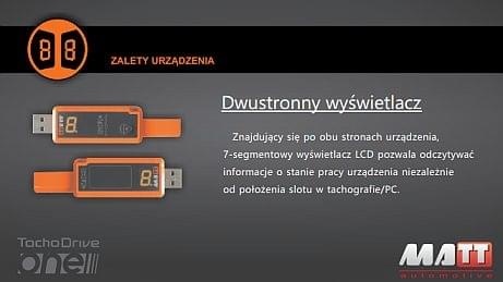- obustronny wyświetlacz (ułatwia to obserwowanie stanu pracy urządzenia dla różnych typów tachografów)
