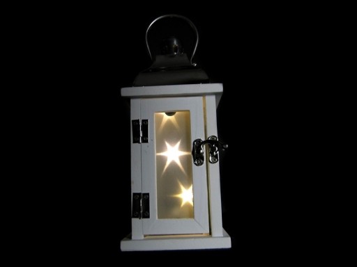 Przedstawiamy Państwu świecącą, drewnianą latarnię LED z metalowym daszkiem. Drewno jest w kolorze białym. Latarnia posiada uchwyt ułatwiający jej przenoszenie lub zawieszenie. Lampion otwierany jest od frontu a boki lampionu są przeszklone.