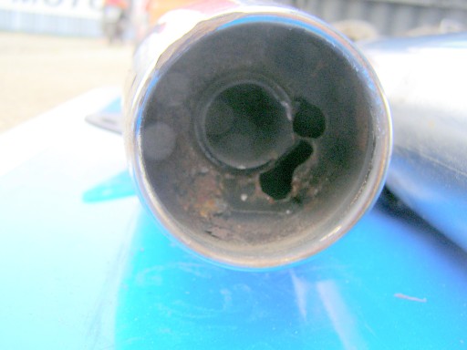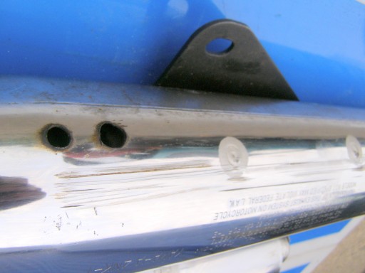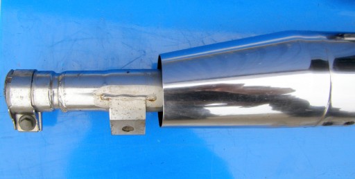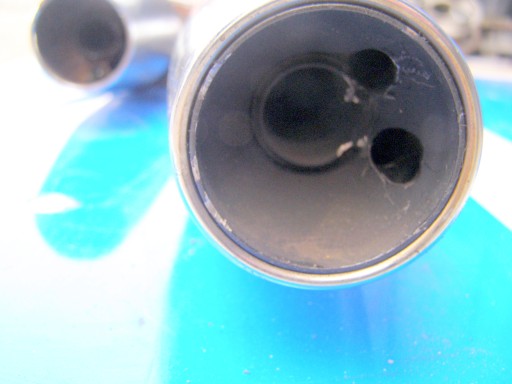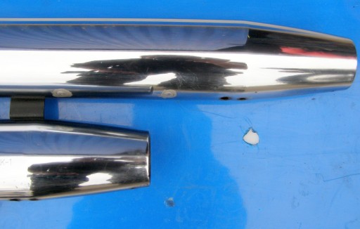 Lewy tłumik posiada małe zarysowanie oraz rozwiercenia na końcu wydechu.