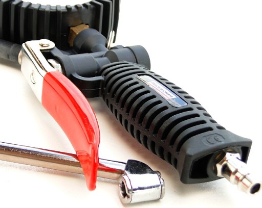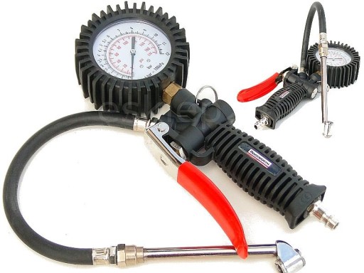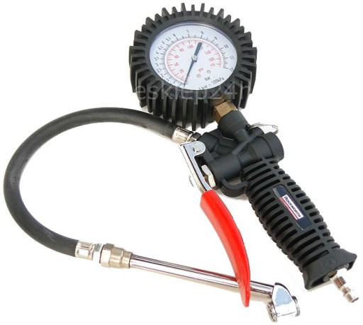 To profesjonalny, duży pistolet do pompowania kół, wyposażony w precyzyjny manometr.