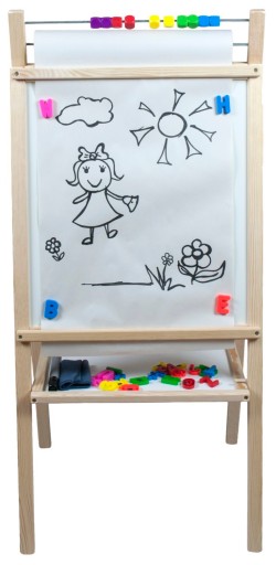 Drewniana, dwustronna i rozkładana tablica magnetyczna to świetny pomysł na kreatywną zabawę Twoich Pociech. Nauka przez zabawę to najlepszy sposób na prawidłowy rozwój dzieci. Tablica jest idealnym miejscem na ćwiczenie pierwszych literek oraz cyferek. To także świetne miejsce do rozwijania zmysłu artystycznego przez wykonywanie wspaniałych rysunków. Jest również przyrząd wspomagający naukę liczenia - liczydło z kolorowymi kulkami! Z jednej strony jest to tablica magnetyczna do pisania markerami, z drugiej - tradycyjna tablica kredowa.