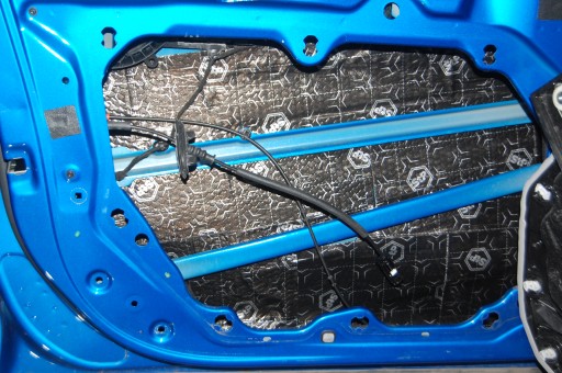 - Maty butylowe naklejamy na niedużą zakładkę. Omijamy miejsca montażowe na śruby, a wiązki elektryczne wyciągamy na zewnątrz.
