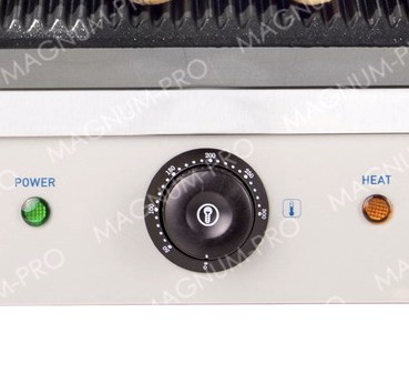 Niezwykle łatwa i intuicyjna obsługa za pomocą termostatu z płynną z regulacją temperatury do 300°C na dwóch płytach grzewczych. Dzięki doskonałym żeliwnym płytom grzewczym, które długo utrzymują temperaturę urządzenie jest energooszczędne.