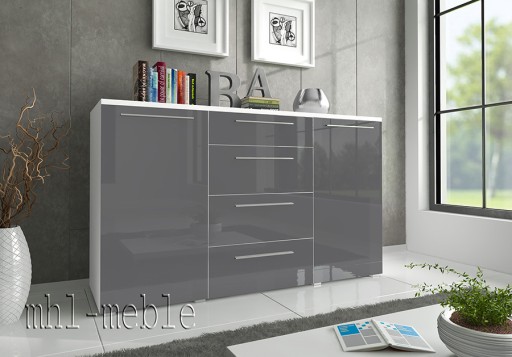 Nowoczesna duża komoda ROMA 2 z frontami w wysokim wysokim połysku. Korpus komody wykonany z odpornej na zarysowania płyty laminowanej w kolorze białym. Fronty wykonane z mdf pokryte specjalną powłoką akrylową dającą niesamowity efekt wysokiego połysku. Wieniec górny wykonany z pogrubianej płyty grubości 22mm.Komoda może być idealnym uzupełnieniem produkowanych przez nas meblościanek lub samodzielną bryłą nadającą nowoczesny charakter każdego wnętrza.