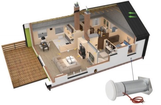 Świeże powietrze zewnętrzne doprowadzone jest przez nawietrzaki zamontowane w pokoju dziennym lub sypialni. Zasysane powietrze przepływa przez kolejne pomieszczenia i usuwane jest przez kratkę wentylacyjną zamontowaną najczęściej w kuchni lub łazience.