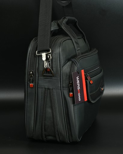 Torba w klasycznym wzorze pasująca do eleganckich jak również do codziennych ubiorów. Doskonała do przenoszenia dokumentów, elektroniki użytkowej, rzeczy codziennego użytku. Wykonana z tkaniny poliestrowej wzmocniona od spodu powłoką poliuretanową. Posiada 10 kieszeni w tym 5 na suwak. W środku dwie główne komory w jednej z nich mniejsza kieszonka na dokumenty w drugiej kieszeń z mocowaniem na laptop. Wymiary wewnętrzne największej kieszeni 30 x 40 x 6 - 8 cm. Miejsce na laptop o wymiarach 28 x 37 x 4 cm. Na przodzie pod emblematem szeroki schowek zamykany na rzep. Obok kieszeń z miejscem na telefon, długopisy itp. W tylnej części komora o wymiarach 30 x 40 x 3 cm na dokumenty, prasę. Pasek z regulacją o maksymalnej długości do 120 cm.