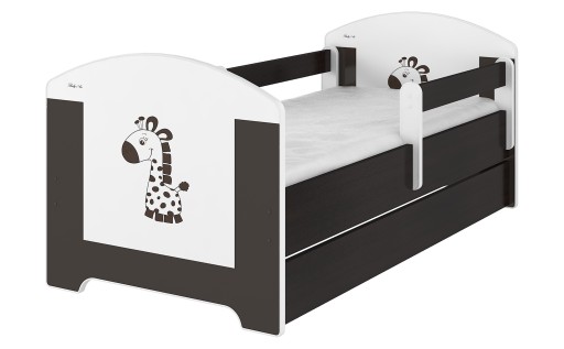 Łóżeczko wykonane jest z płyty wiórowej wykończonej miękką okleiną. Do wyboru maja Państwo płytę w kolorze surf biały ona połaczona jest z kolekcjami kolorowy oraz z wersją grawer . Grawer wykonany też jest w płycie dąb sonoma . Natomiast brązowa żyrafa połączona jest z płytą venga