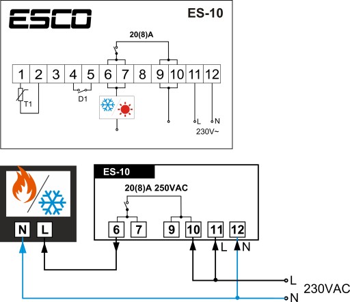 Regulator temperatury, uniwersalny z funkcją grzanie/chłodzenie i alarmem MIN i MAX, NO: ES10