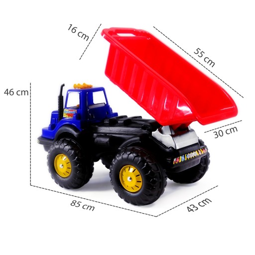 Rozmiary wywrotki pozwalają dziecku na swobodę jej obsługi ponieważ, nawet maluchy uczące się chodzić podpierając się na skrzyni przepychają ją do przodu.