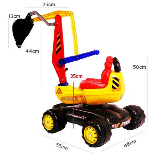 Koparka zapewnia świetną zabawę w ogrodzie, na placu zabaw,a także w domu. Dziecko siedząc na koparce może obracać się,steruje łyżką za pomocą dwóch wygodnych w obsłudze dźwigni.