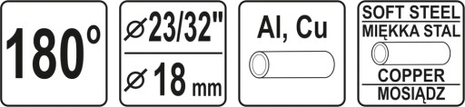 Giętarka do rur o średnicy 18mm. Umożliwia wyginanie rur pod kątem 180° bez ich zgniecenia. Na korpusie wytłoczone są kąty pozwalające określić stopień wygięcia. Zamek polepsza mocowanie rur i umożliwia gięcie nawet krótkich odcinków. Pozwala na wyginanie rur wykonanych z: Miękkiej miedzi, Aluminium, Miękkiej stali.