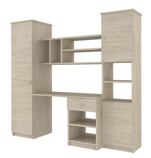 Meblościanka składa się z czterech połączonych ze sobą elementów, wyposażonych w praktyczne półeczki.