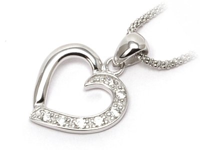 Oferujemy uroczy srebrny komplet: fantazyjny wisiorek w kształcie stylizowanego serduszka z cyrkoniami oraz łańcuszek. Naszyjnik - zawieszka i łańcuszek - w całości wykonany jest z rodowanego srebra. Warstwa twardego, szlachetnego rodu zabezpiecza srebro przed oksydowaniem (ciemnieniem) i rysowaniem się powierzchni.