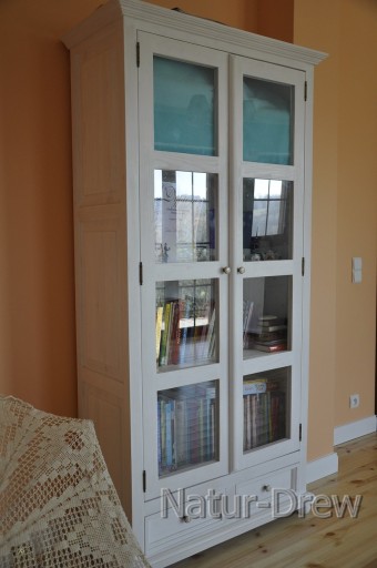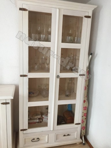 - Drewniana Witryna prezentuje sie naprawdę wyjątkowo dzięki regularnym i unikatowym kształtom ,wewnątrz umocowano cztery półki ,które są bardzo praktyczne przy tym meblu,oraz dwie funkcjonalne szuflady,dodatkowo cały charakter podkreślają ręcznie kute okucia ,jak i zawiasy ,mebel tak wykonany nadaje duszy w pomieszczeniu w którym się znajduje