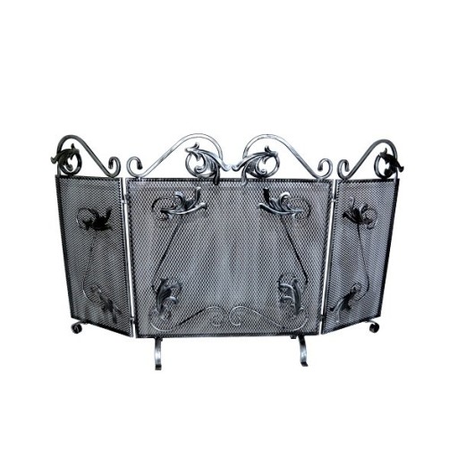 Rozkładana trzyczęściowa osłona kominkowa. Całość wykonana z metalu - rama z profili, środek wypełniony siatką.Dzieło kowalstwa artystycznego stanowiące doskonałą dekorację Twojego kominka.Osłona jest wyposażona w nóżki zapewniające stabilność.