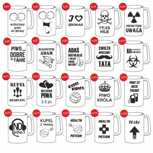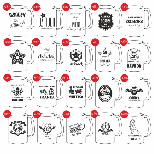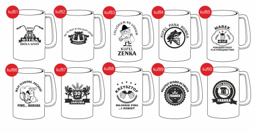 Jeżeli szukają Państwo wyjątkowego prezentu dla bliskiej osoby. Mamy na to świetną propozycję. Kufel z grubego szkła z własnym grawerem. Na kuflu możemy wygrawerować dowolny tekst lub grafikę. Grawerowanie laserem charakteryzuje się doskonałą jakością oraz perfekcją wykonania. Poniżej prezentujemy przykładowe wzory które można dowolnie modyfikować i łączyć ze sobą. Istnieje również możliwość zrealizowania własnych pomysłów na niepowtarzalny upominek. Kufel do piwa z grawerem idealnie nadaje się na takie uroczystości jak: imieniny, urodziny, Dzień Ojca, Dzień Dziadka, wieczór kawalerski, z okazji walentynek, z okazji 18 urodzin i wiele innych...