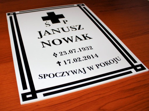 Na niniejszej aukcji oferujemy wysokiej jakości tabliczkę nagrobną wykonaną z mocno błyszczącej białej lub czarnej plexi o grubości 3mm oraz odpornej na warunki atmosferyczne folii samoprzylepnej.