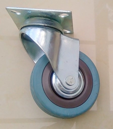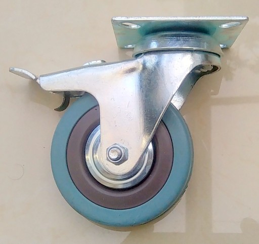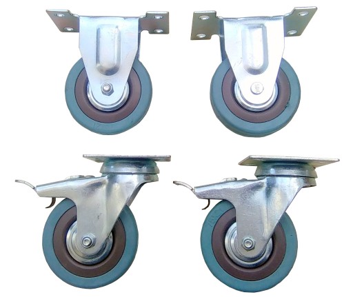 Koła mocowane na tzw. płytkę są połączeniem widelca aparaturowego wykonanego z tłoczonej blachy stalowej oraz koła z piastą polipropylenową i oponką z szarej niebrudzącej gumy. Głowica skrętna widelca jest podwójnie ułożyskowana. Wszystkie elementy metalowe zestawu pokryte są antykorozyjną powłoką chromowo-cynkową. Hamulec blokuje koło i głowicę.