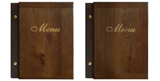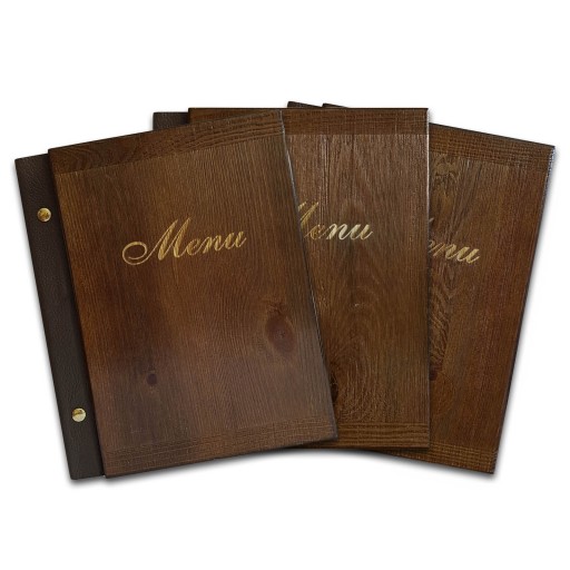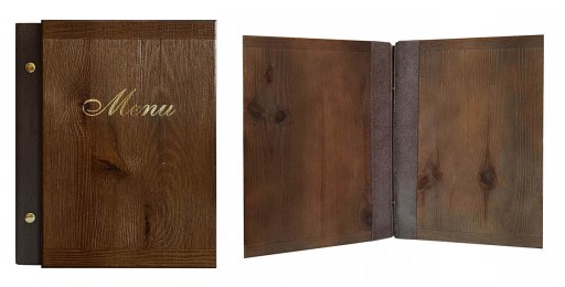 КАРТОЧКА МЕНЮ А5, ДЕРЕВЯННАЯ ОБЛОЖКА С КОЖАНЫМ МЕНЮ
