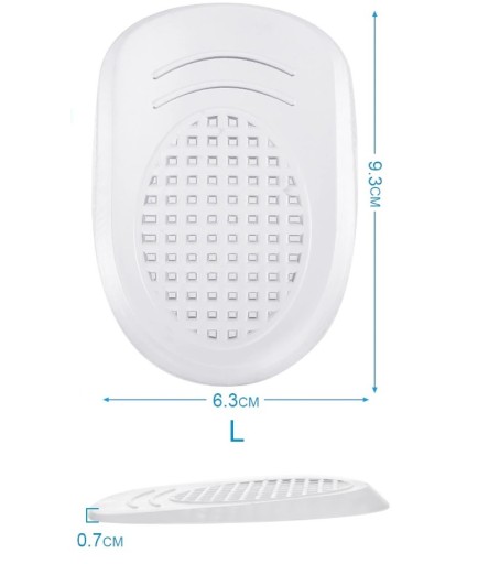 Wysokiej jakości podpiętki żelowe wykonane z wytrzymałego silikonu, który łatwo dopasowuje się do stopy. Zmniejsza nacisk ciała na piętę, co jest bardo istotne w przypadku ostróg piętowych. Podnoszą komfort chodzenia oraz pomagają wygładzić skórę na stopach i zapobiegać odciskom. Wkładki wklejane do buta - nie przemieszczają się podczas chodzenia.