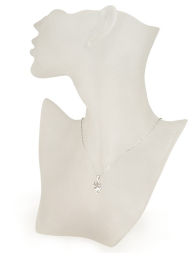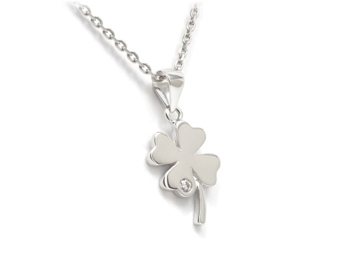 Oferujemy uroczy, srebrny komplet: wisiorek z cyrkonią w kształcie czterolistnej koniczynki na szczęście i modny łańcuszek. Zawieszka i łańcuszek w całości wykonane są z rodowanego srebra. Warstwa twardego, szlachetnego rodu zabezpiecza srebro przed oksydowaniem (ciemnieniem) i rysowaniem się powierzchni.