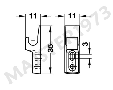 Opis: zaczep jest wykonany z metalu, dużo mocniejszy i trwalszy niż z tworzywa. Stosuje się go do zatrzasków MINI LATCH montowanych w szafkach otwieranych bez uchwytów. Posiada dwa otwory montażowe fi 3 mm. Jeden otwór jest owalny co umożliwia wyregulowanie zaczepu względem zatrzasku przed jego ostatecznym przykręceniem na stałe.