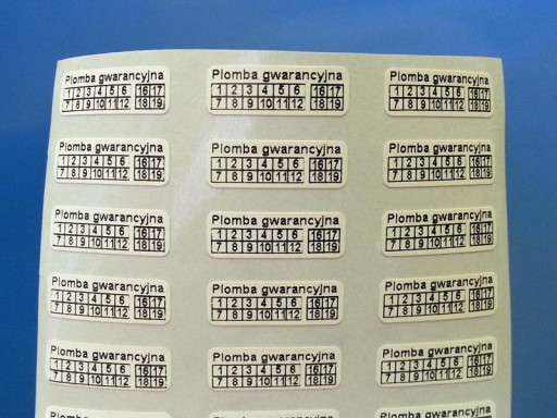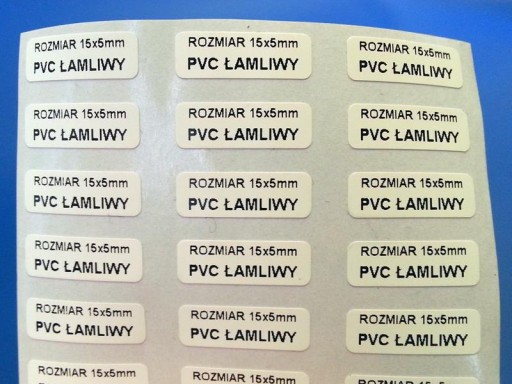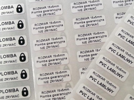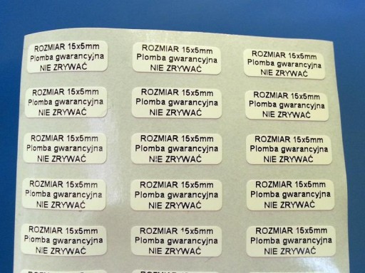 Oferujemy wykonanie 1000 sztuk plomb gwarancyjnych w rozmiarze 15x5mm, z BIAŁEJ ŁAMLIWEJ FOLII PVC. Materiał posiada silne właściwości destrukcyjne.