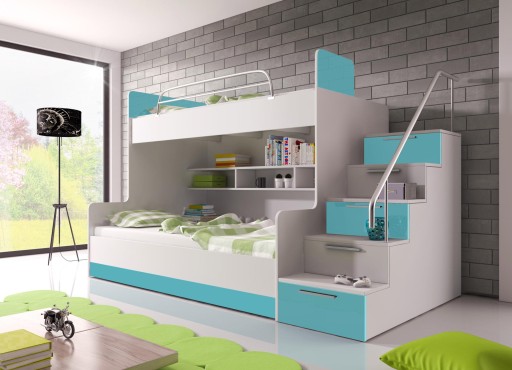 Łóżko cechuję się nowoczesnym wzornictwem oraz precyzyjną jakością wykonania, zapewnia wyjątkowo dobry sen oraz gwarancję bezpieczeństwa i pewność, że Twoje dziecko obudzi się wypoczęte. Fronty zestawu są wykonane z płyty meblowej MDF na wysoki połysk w bogatej kolorystyce, która pozwoli dopasować mebel do każdego pokoju. Górna powierzchnia spania oraz schodki przy łóżku wyposażone są w barierki, chroniące twoje dziecko przed wypadnięciem.