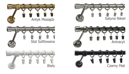 Kolekcja kompletnych, solidnych karniszy metalowych zbudowanych z elementów o średnicy 19 mm.