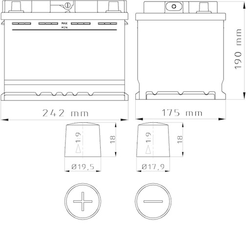 - Biegunowość: "+" po prawej stronie, "-" po lewej stronie