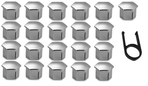 Oferujemy Państwu komplet 21 sztuk chromowanych nakładek na śruby na klucz 19 mm wraz z kluczem do demontażu.