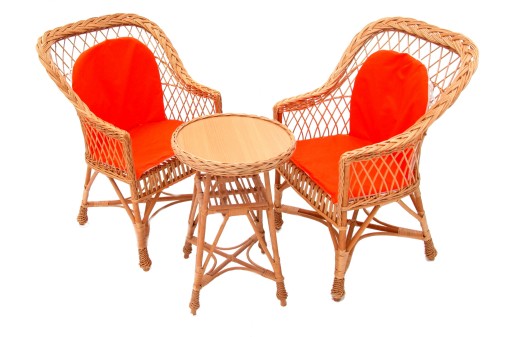 Wykonany tradycyjnie z rodzimej wikliny . Przepiękny wzór plecionki wykorzystanej w dwóch fotelach