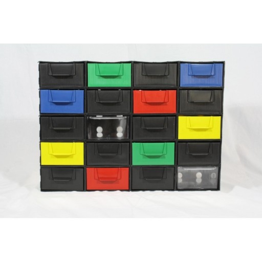 Obudowa jest wykonana z bardzo trwałego tworzywa w kolorze czarnym. Cena obejmuje komplet 10 modułów oraz 10 szufladek w kolorze zbliżonym do koloru widocznego na pierwszym zdjęciu.