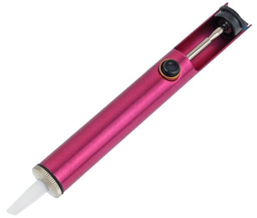 Powstałe w ten sposób podciśnienie wciąga przez otwór w końcówce odsysacza cynę do wnętrza tłoka. W trakcie używania odsysacza ręcznego elektronik ma zajęte dwie ręce. W jednej trzyma lutownicę,a w drugiej odsysacz. Warto przypomnieć że sprężynę odsysacza naciągamy ręcznie i dopiero po nabraniu pewnej wprawy możemy ją naciągać przy pomoc jednej dłoni. Tym samym początkujący elektronicy w trakcie odsysania cyny lutownicą i odsysaczem ręcznym na początku mają tylko jeden “strzał”. W przypadku niezebrania całości cyny operację należy powtórzyć.