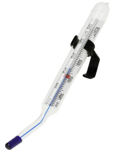 Spirytusowy, szklany termometr fotograficzny (kątowy), z klipsem, przeznaczony do mierzenia temperatury roztworów w kuwecie. Zakres temperatur 0oC - 50oC, stałe oznaczenie 18oC, długości 85 mm + 45 mm, średnica 10 mm.