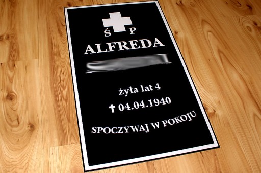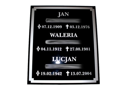 Na niniejszej aukcji oferujemy wysokiej jakości tarczę nagrobną wykonaną z mocno błyszczącego tworzywa (połysk zbliżony do szkła) oraz odpornej na warunki atmosferyczne folii samoprzylepnej.