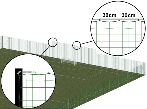 2. Lina stalowa powinna być rozciągnięta wzdłuż dolnej i górnej długości siatki. W przypadku, gdy słupy nie posiadają uchwytów mocujących siatkę, należy zamocować wzdłuż nich dodatkowe linki (w przypadku siatek o wysokości powyżej 5 m stosuje się dodatkową linkę wzdłuż długości siatki, puszczoną po środku jej wysokości).