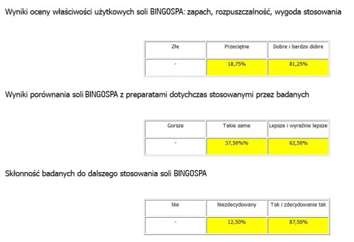 Wyniki oceny właściwości użytkowych soli BINGOSPA: zapach, rozpuszczalność, wygoda stosowania
