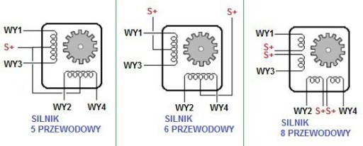 Sterownik współpracuje z silnikami unipolarnymi które posiadają wewnątrz 4 uzwojenia i 5, 6 lub 8 przewodów wyjściowych. W przypadku silników 8 przewodowych końce wszystkich uzwojeń są wyprowadzone na zewnątrz, w przypadku silników 6 przewodowych każde 2 uzwojenia są na środku już połączone w silniku. A w silnikach 5 przewodowych wszystkie 4 uzwojenia są połączone w środku i wyprowadzone jako 1 przewód. Ukazuje to poniższy rysunek, zawsze 1, 2 czy 4 przewody oznaczone na rysunku jako S+ podłączamy do pinu S+ sterownika i do zasilania + silnika. Pozostałe 4 przewody do wyjść WY1...Wy4 sterownika. Poszczególne przewody odnajdujemy korzystając z dokumentacji silnika lub badając np. omomierzem.