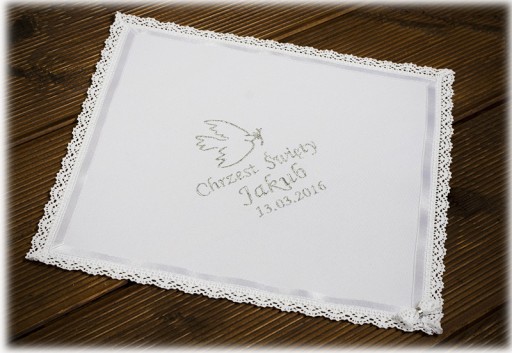 - Szatka do Chrztu w kształcie kwadratu, z personalizowanym haftem w kolorze srebrnym, obszyta delikatną koronką i białą satynową wstążką.,jeśli satynowa tasiemka wokół szatki ma zostać, a zmieniają Państwo koronkę, proszę o tym napisać